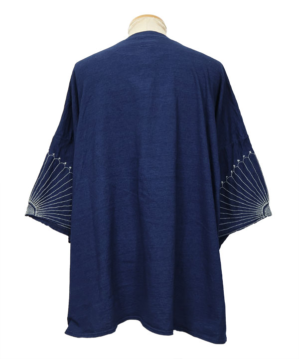 インディゴ天竺 HUGE-T(風呂敷刺繍)両袖に伝統民芸である刺し子を施した風情のあるHUGE-T。インディゴの天竺生地で仕立てており、ゆったりとしたビッグシルエットとなっています。経年変化によるインディゴの風合いも楽しめる一枚!ぜひお試しください。カラー:インディゴ