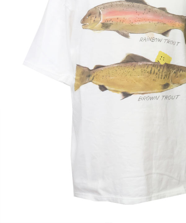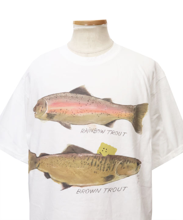 天竺クルーT(トラウト2匹PECKISH RAINBOWY pt)柔らかくて心地良い綿100%天竺生地を使用するTシャツです。トラウト2匹とクッキーになったRAINBOWYをプリントしたクルーネックTEE。カラー:ホワイト