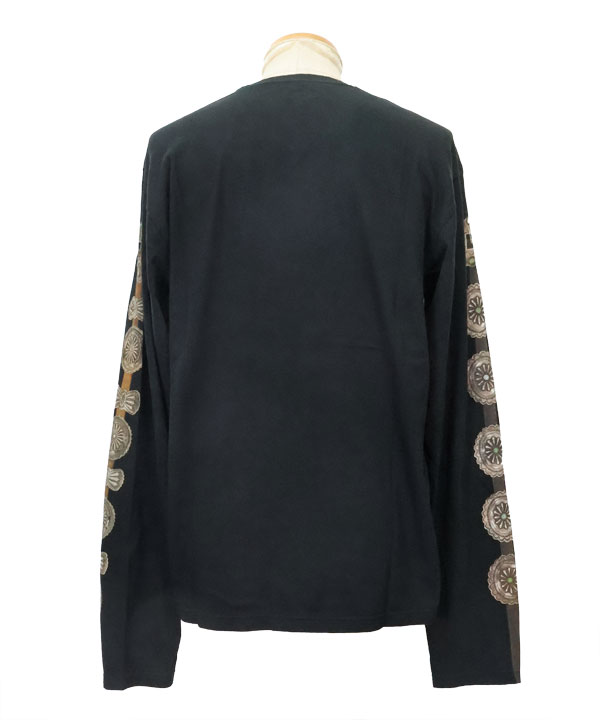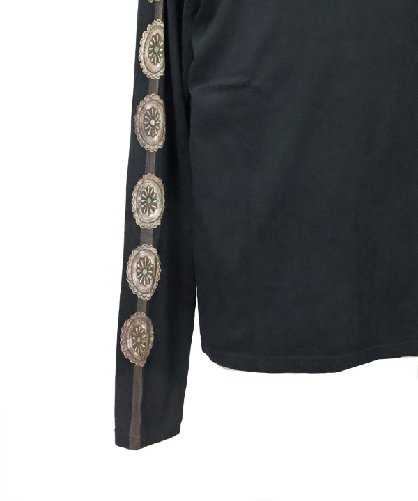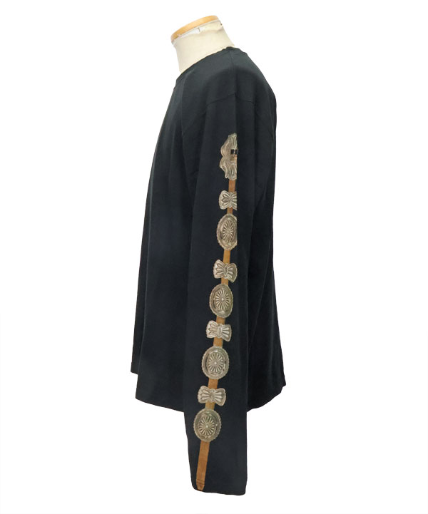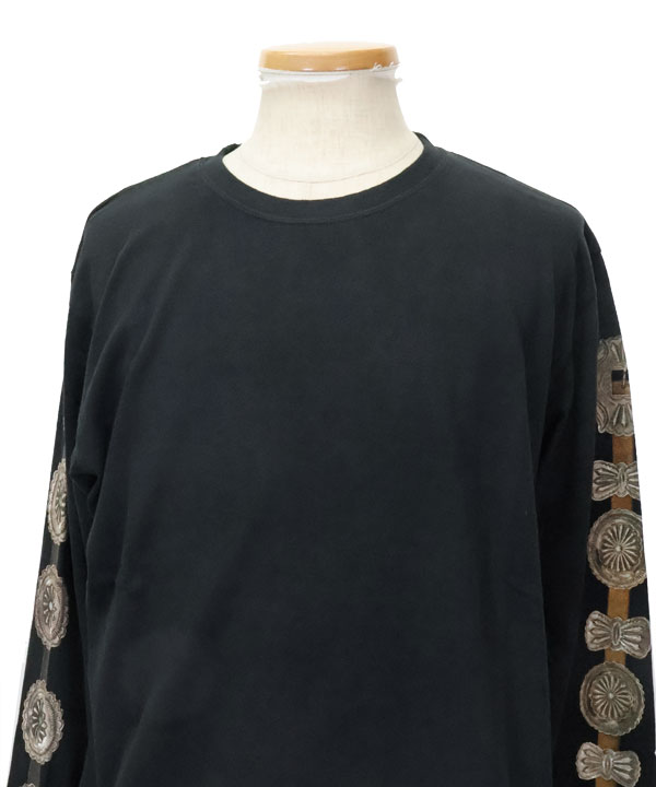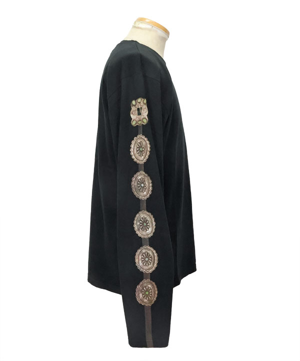 天竺クルーロンT(コンチョベルトスリーブ)柔らかくて心地良い綿100%天竺生地を使用するロンTEEです。ヴィンテージのコンチョベルトを両袖にプリントしたクルーネックロンTEEです。NEWモデル!ぜひお試しください。カラー:ブラック
