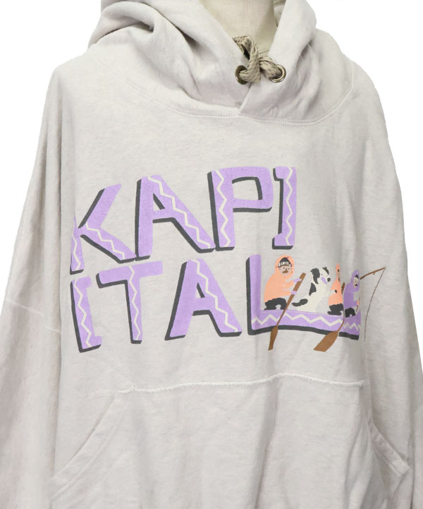 KAPITALジーンズの革ラベルに使用されている「KAP][TAL」のロゴをフロントにプリントした、ショート丈でビッグシルエットのフードスウェットです。