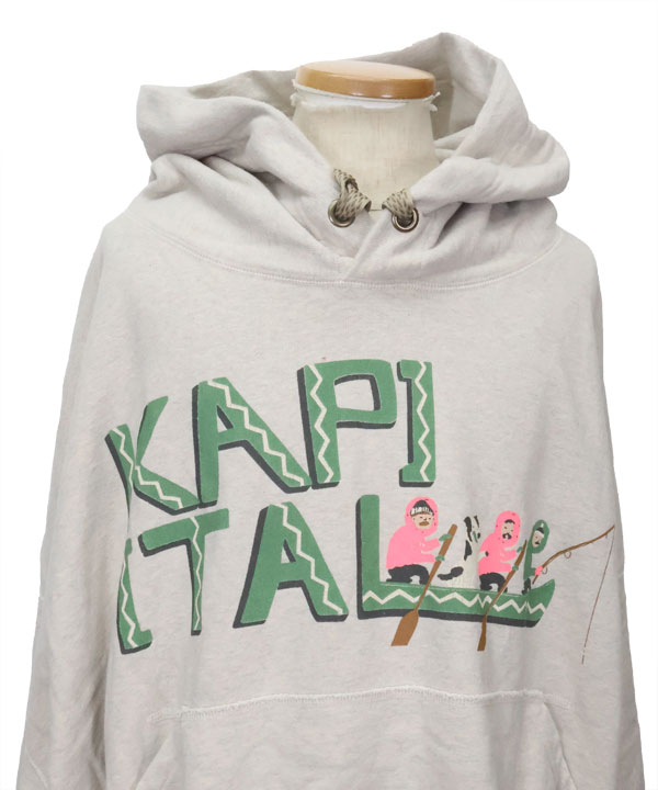 KAPITALジーンズの革ラベルに使用されている「KAP][TAL」のロゴをフロントにプリントした、ショート丈でビッグシルエットのフードスウェットです。