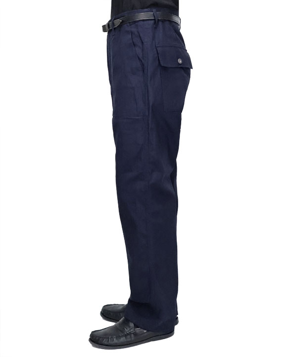 ミリタリーパンツを代表するベイカーパンツをモチーフにベルトループにDカンをつけ、またウエストアジャストベルトはクラシックな流線型とするなどのアレンジを加えた一本。