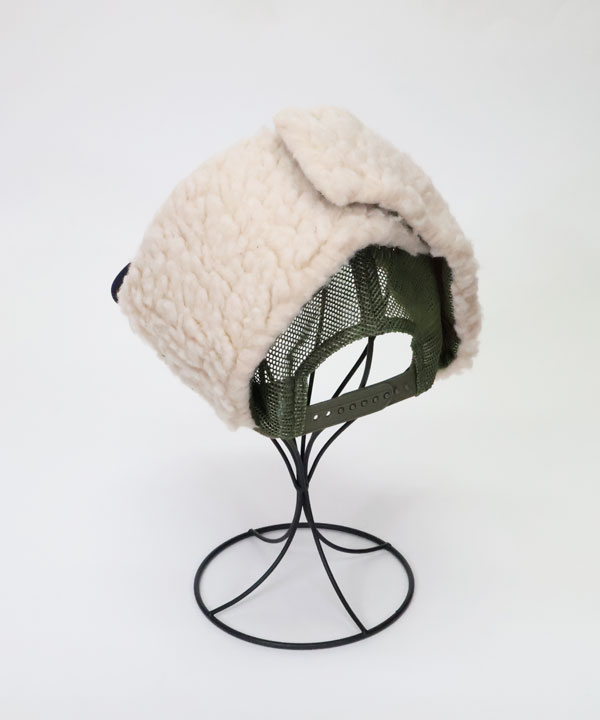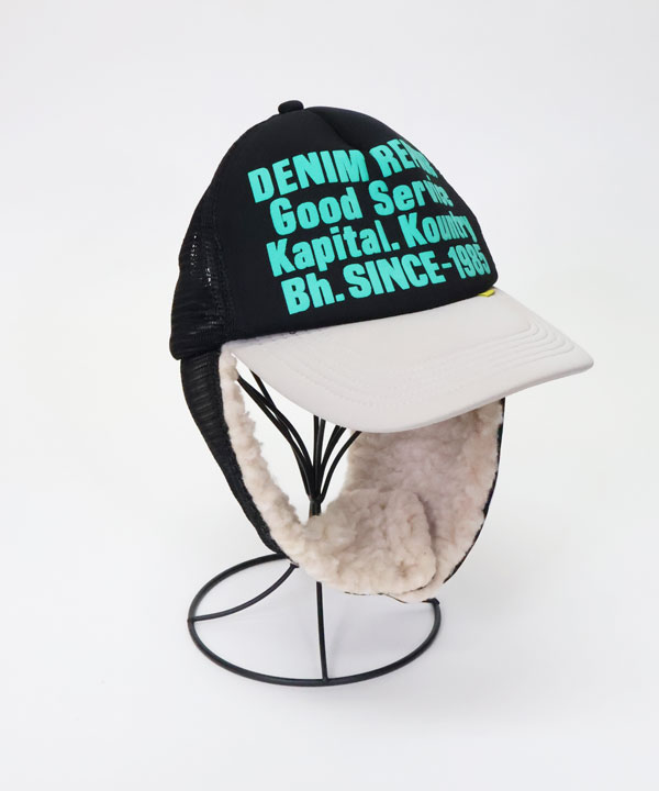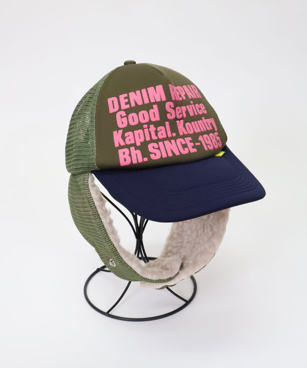 DENIM REPAIR SERVICEpt ランバートラックCAPフロントに発泡プリントを施したトラックCAP。内側の縁がパイル地になっています。そしてボア耳当て付きデザイン!お楽しみください。ブラック×グレーカーキ×ネイビーワンサイズ展開