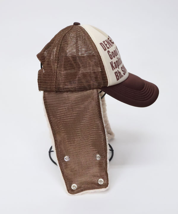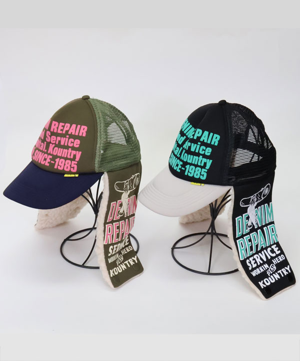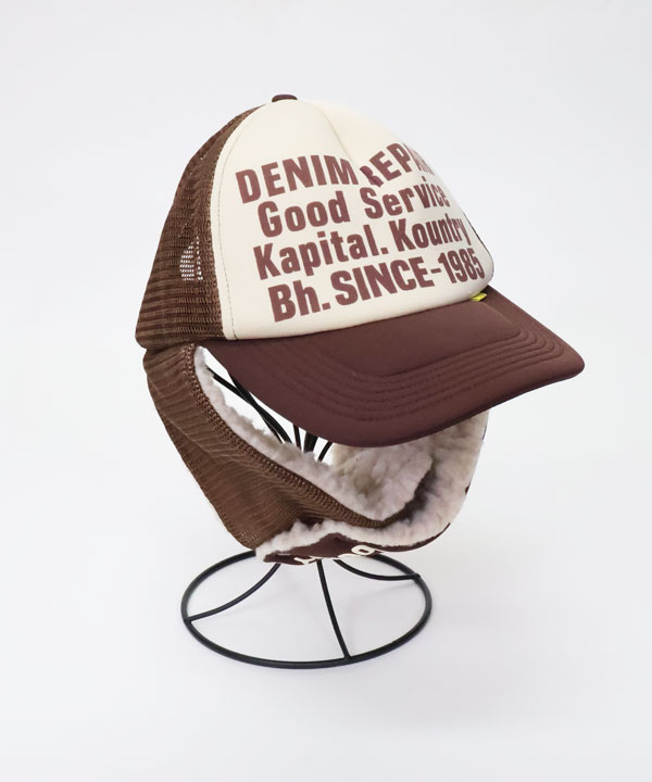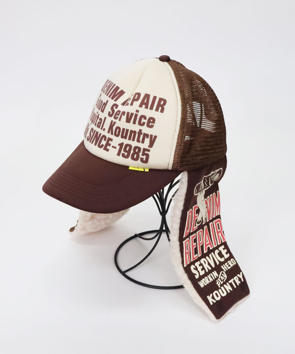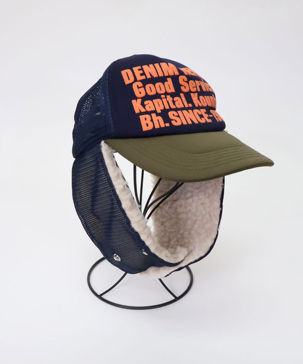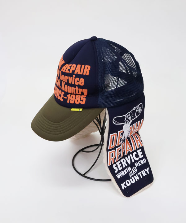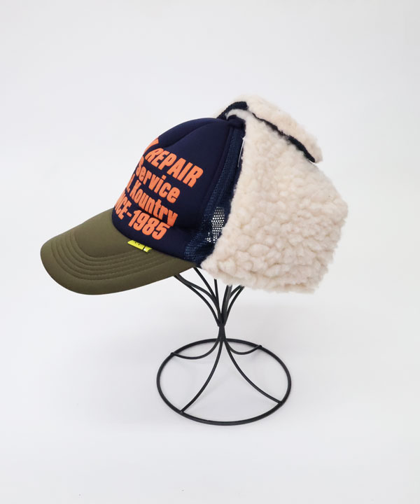 DENIM REPAIR SERVICEpt ランバートラックCAPフロントに発泡プリントを施したトラックCAP。内側の縁がパイル地になっています。そしてボア耳当て付きデザイン!お楽しみください。キナリ×ブラウンネイビー×カーキワンサイズ展開