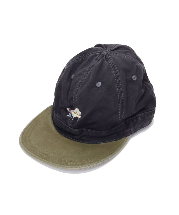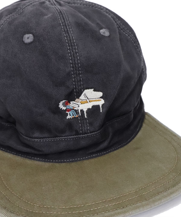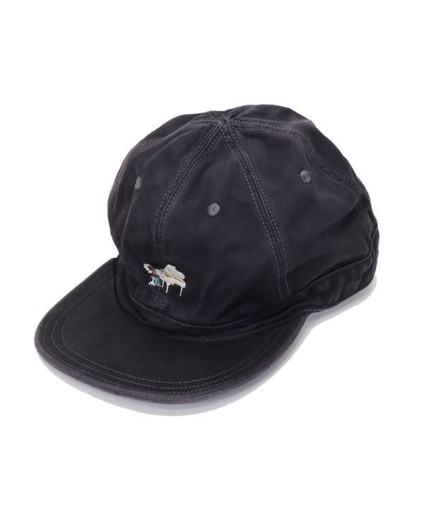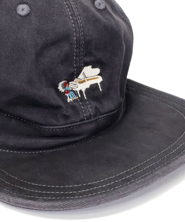 ムラチノ プリムフィールドCAP(LIFE SCHERZO)洗いの施された加工感あるキャップです。グランドピアノを弾くネイティブアメリカンの刺繍が施されています。サイズ調整可能ワンサイズ展開ブラック×ブラック(つば)ブラック×ブラウン(つば)