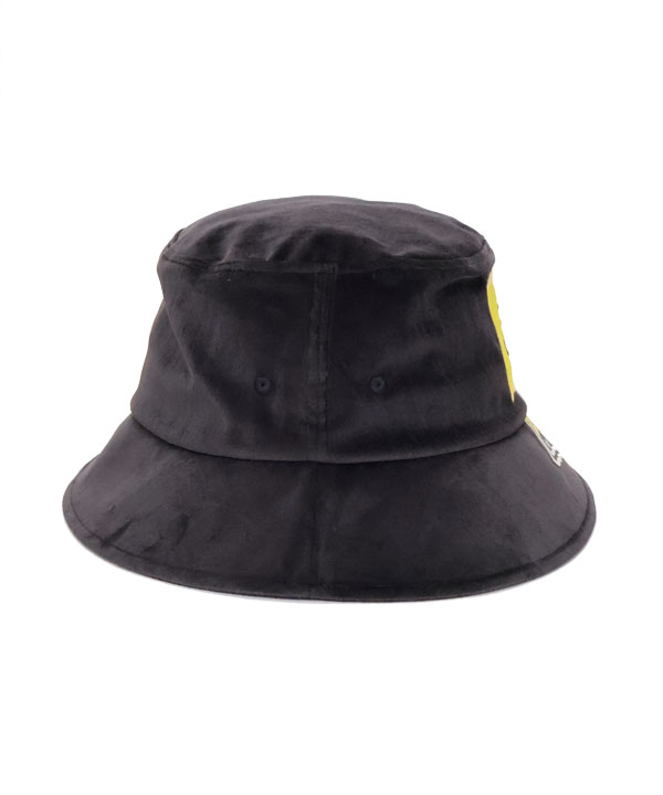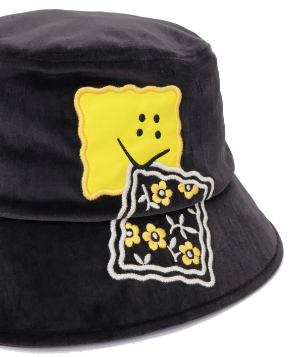 別珍バケットHAT 短ツバ(PECKISH RAINBOWY刺繍)別珍生地のバケットに、クッキーになったRAINBOWYと、ヴィンテージバンダナに見られるクッキー柄をデザインしています。パッチと刺繍にて施されています。ワンサイズ展開カラー:ブラック