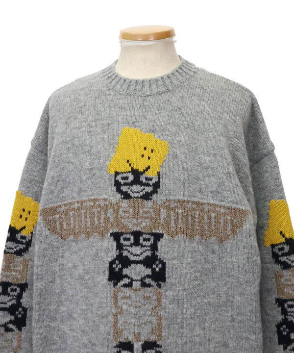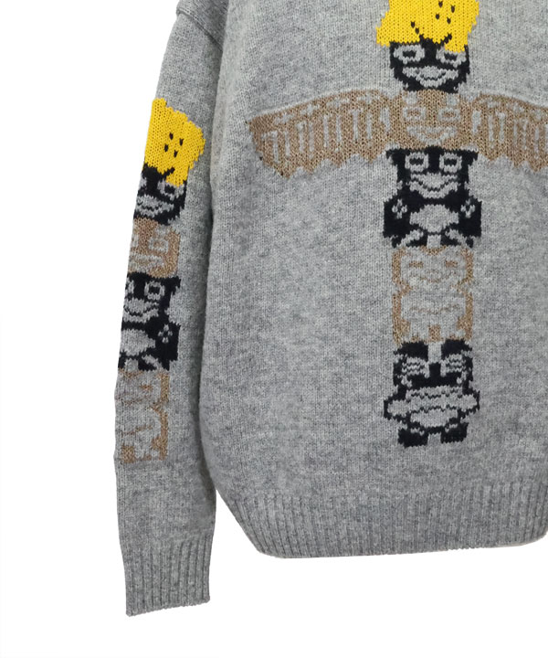 5Gウール PECKISHトーテムポール クルーセーターゆったりしたサイズ感のセーターです。フロントと袖には、クッキーになったRAINBOWYとトーテムポールをデザイン。ざっくり着ていただけるおすすめの一枚です。カラー:グレー1・3サイズ展開アイテム