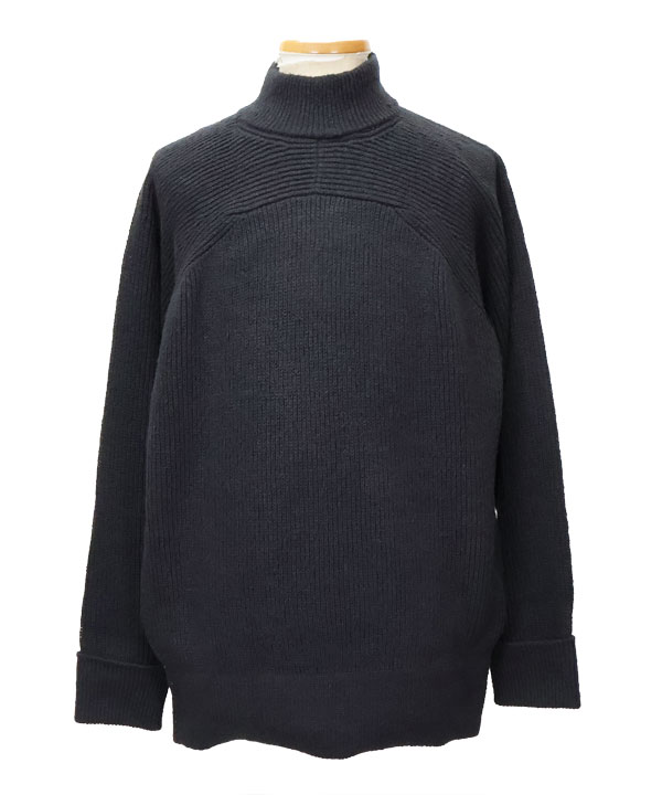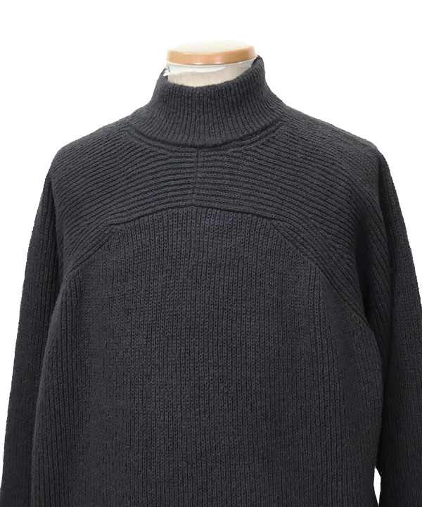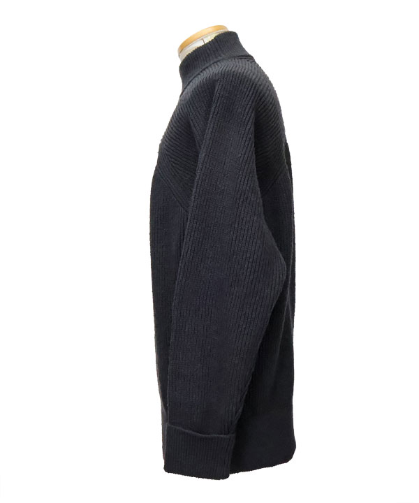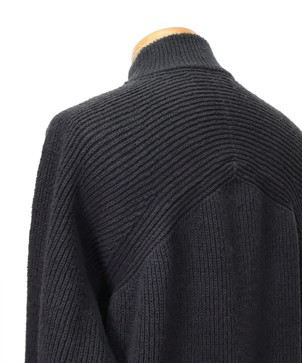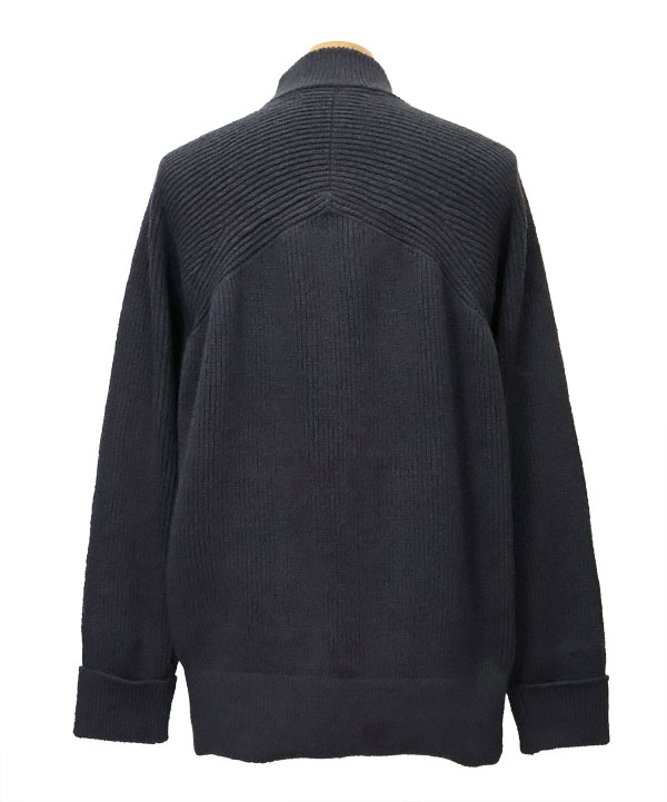 ハンドフレーム機(手横編み機)を駆使して手編み感覚を表現したリブ編みと、通称”ヘラシ”と呼ばれるニットワークで前後にアールした編地のディテールを表現する特殊なデザインとなっています。