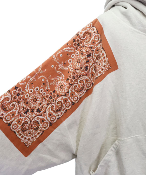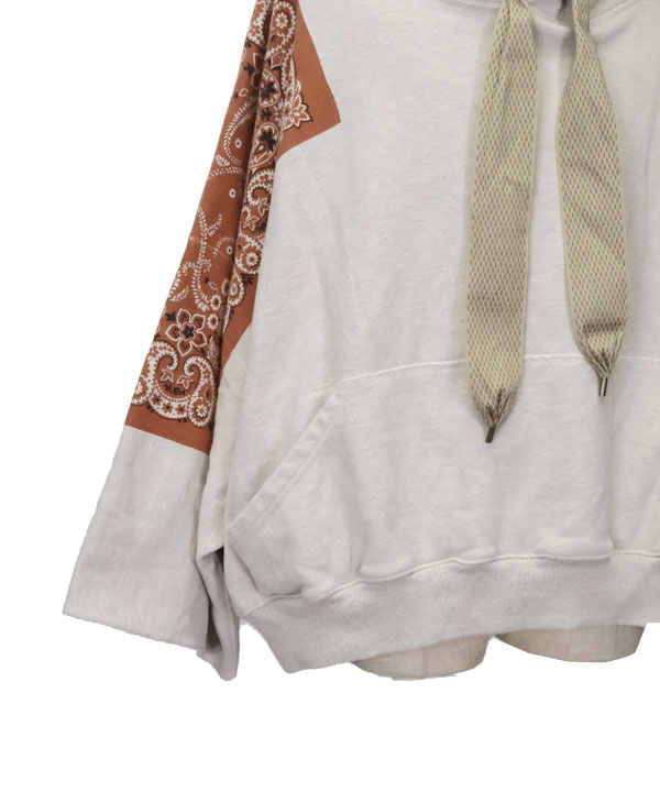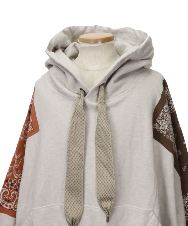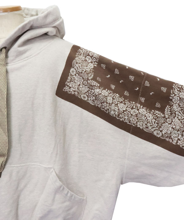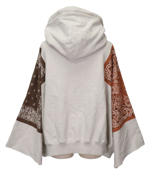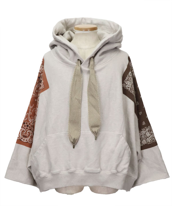 TOP裏毛 バンダナデビルフードパーカー左右に柄の違うバンダナプリントを施したデザインしたショート丈でビッグシルエットのフードスウェットです。首回りが大きくボリュームのあるフードになっており、幅広のフード紐を使用しています。袖口はカットオフ始末で軽やかなデザイン。レイヤードにもお使いいただけます。ぜひお試しください。カラー:ブラウン