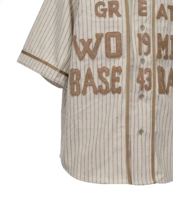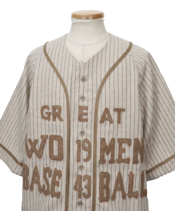 ウールストライプ(細)GREAT WOMEN ベースボールシャツウール生地を使用する細いストライプ柄のベースボールシャツ。シンプルでややワイドなシルエット。そしてフェルトのGREAT WOMENロゴを施しています。レイヤードアイテムとしてお使いいただけます。カラー:キナリ2・3・4サイズ展開