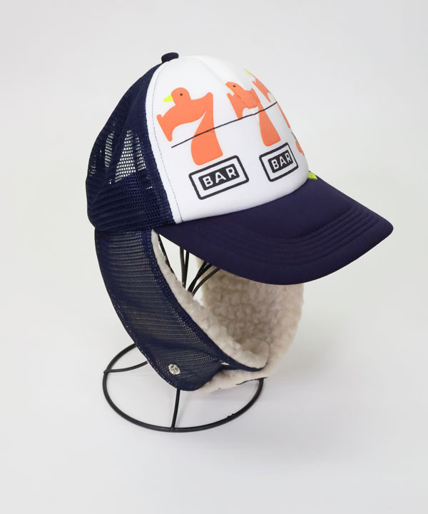 ラッキーバード ランバートラックCAPフロントに発泡プリントを施したトラックCAP。内側の縁がパイル地になっています。そしてボア耳当て付きデザイン!お楽しみください。ホワイト×ネイビーワンサイズ展開