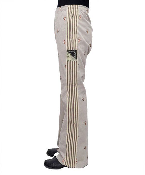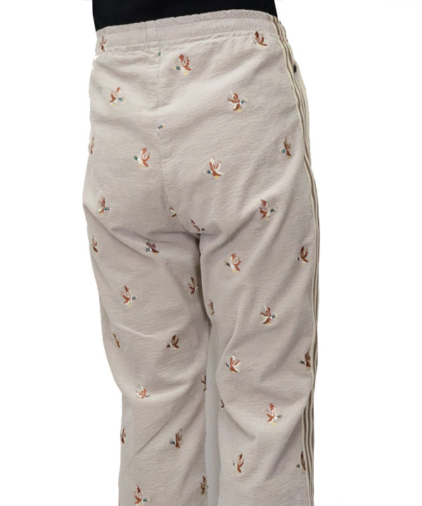 11Wストレッチコーデュロイ 鴨刺繍 トラックパンツ(バナーストライプ)伸縮性あるストレッチコーデュロイ生地に鴨の刺繍が全体に施されたトラックパンツ。ウエストはイージー仕様でサイドのラインもポイントとなる快適な一本です。両裾にファスナーを取り付けています。ぜひお試しください。カラー:グレーベージュ*セットアップにもなります。