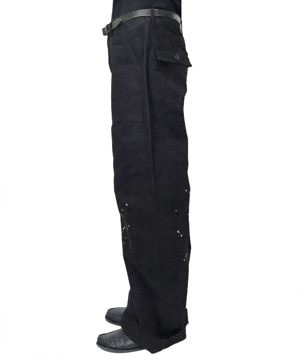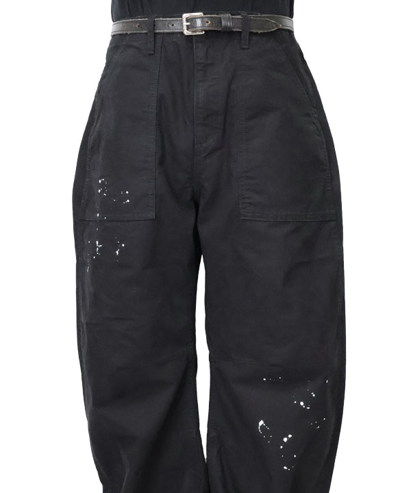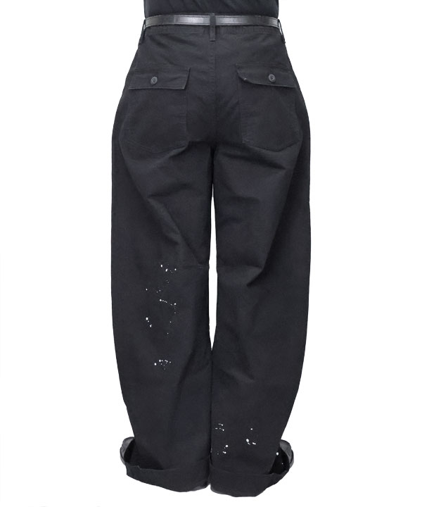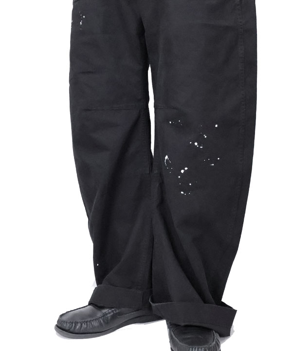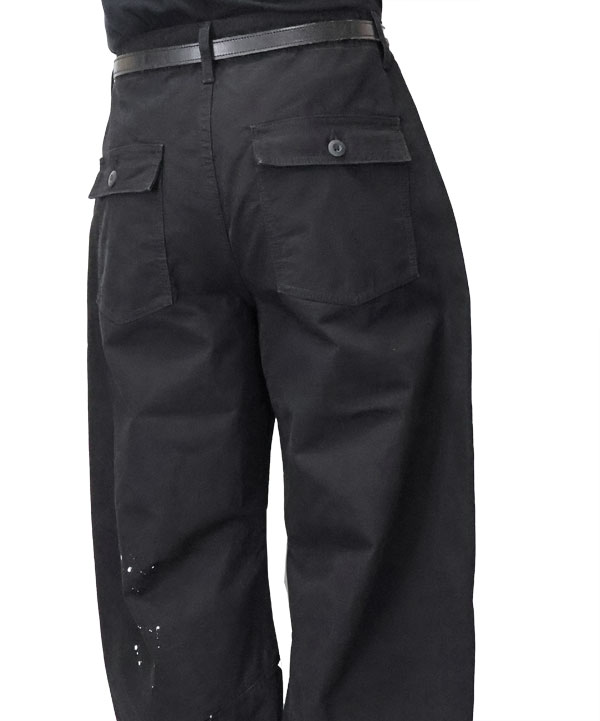 カーブベイカーパンツ立体裁断で独特のシルエットを再現したカーブパンツ。綿100%の顔料染めバックサテン生地を使用したユーズド加工のベイカーパンツとなります。そして随所にペイントが入る。雰囲気ある一本をお楽しみください。カラー:ブラックウエスト小さめですので、表記は Lサイズ/XLサイズの入荷となります。