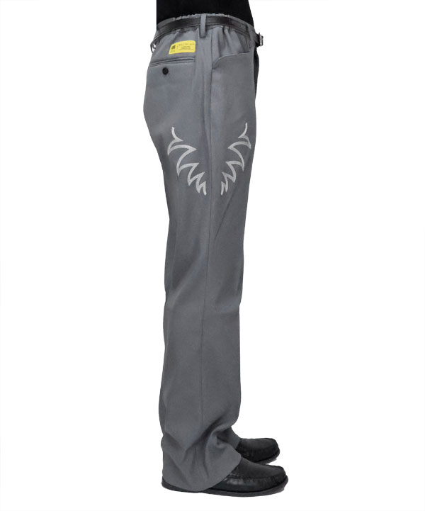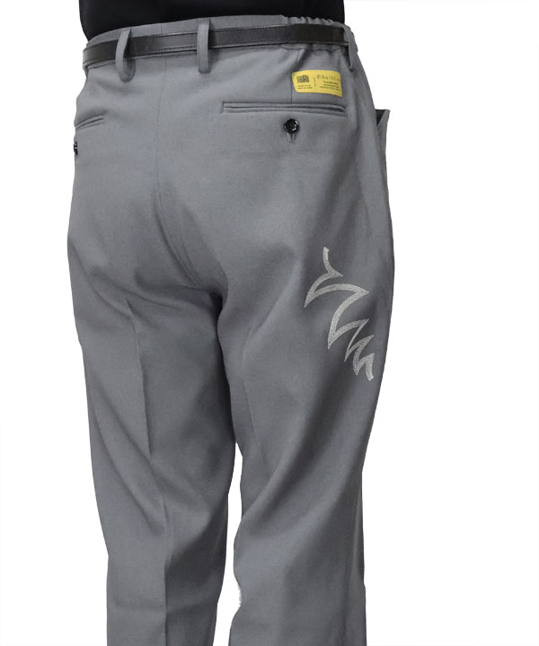 右腿には某ウエスタンブーツからインスピレーションを得た刺繍がギミックアリのインパクトある仕上がりとなっています。