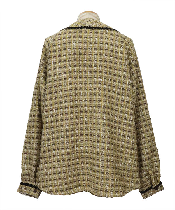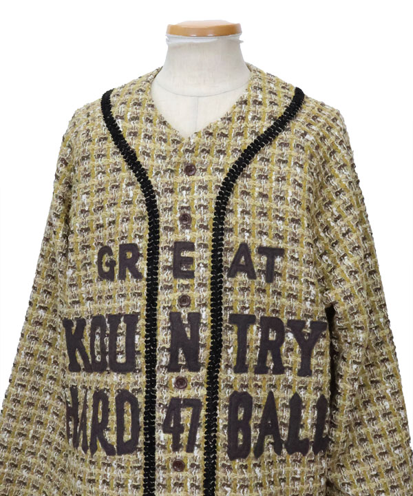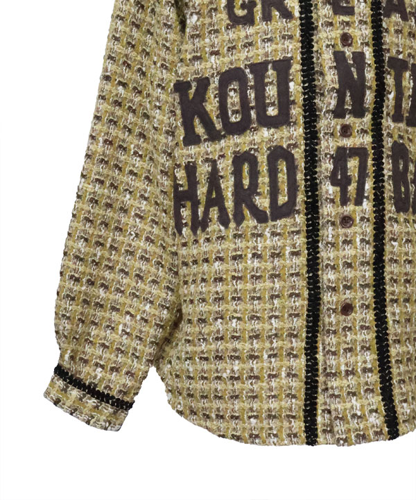 ファンシーツイード GREAT KOUNTRY ベースボールロングスリーブシャツ凹凸ある柄生地のベースボールシャツです。シンプルでややワイドなシルエット。前たてと袖先のブラック色部分にはラメ糸も施しています。そして胸にはフェルトのGREAT KOUNTRYのロゴを!レイヤードアイテムとしてお使いいただけます。ぜひお試しください。カラー:イエロー2・3・4サイズ展開