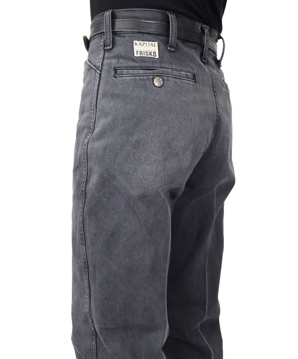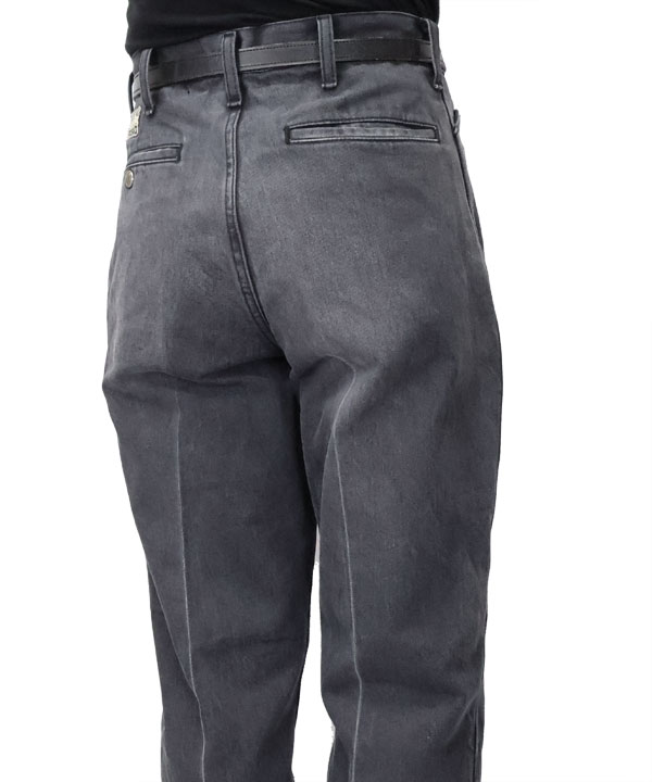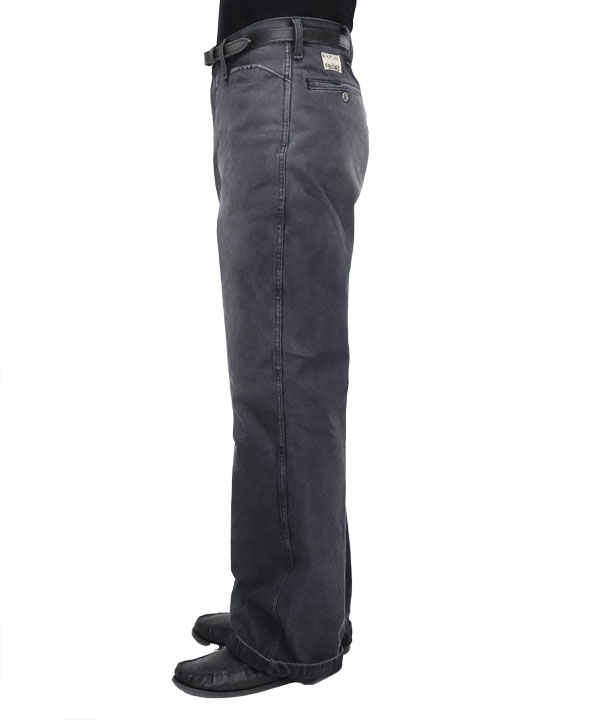14ozブラック×ブラックデニム 5P フリスコ(センタープリーツ加工)14オンスデニム生地を使用するLポケ5ポケットのフリスコデニム。人気アイテム!フレアシルエットで加工も施され、センタープリーツ加工のラインが入ります。カラー:ブラック加工