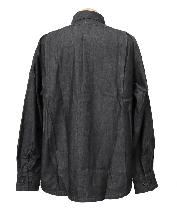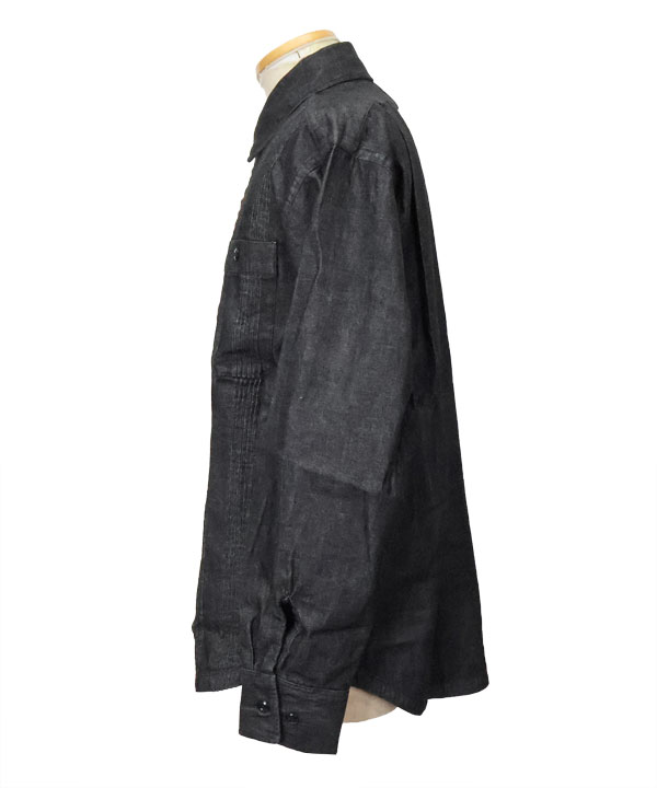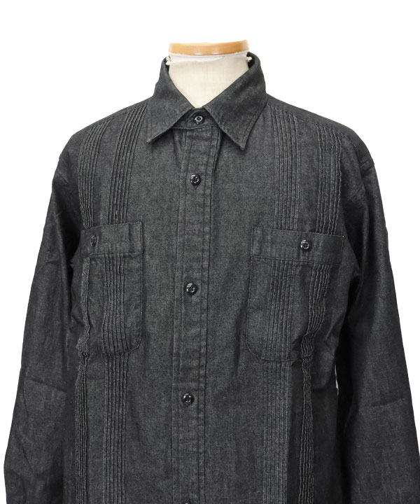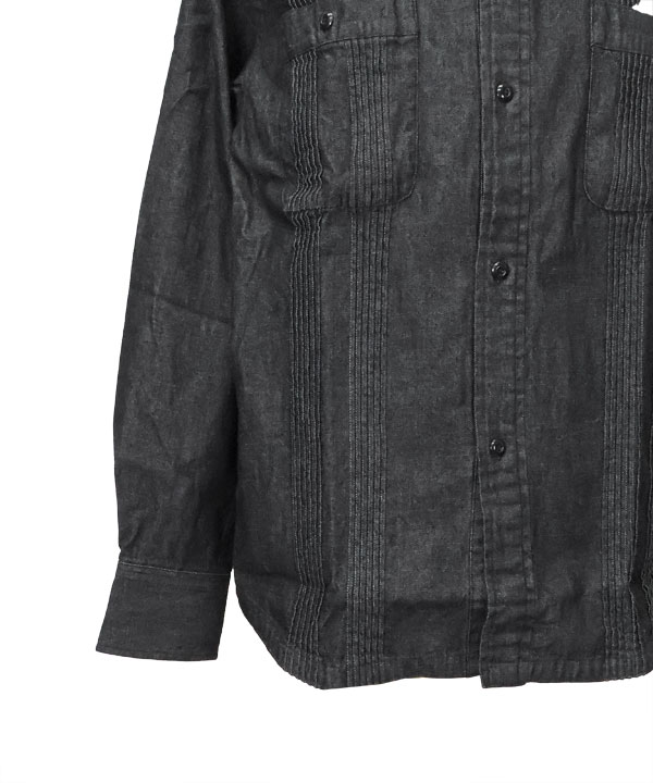 特徴的なキューバシャツのピンタックとチンストラップ付きの台衿、胸パッチポケットなどワークシャツのディティールをミックス。