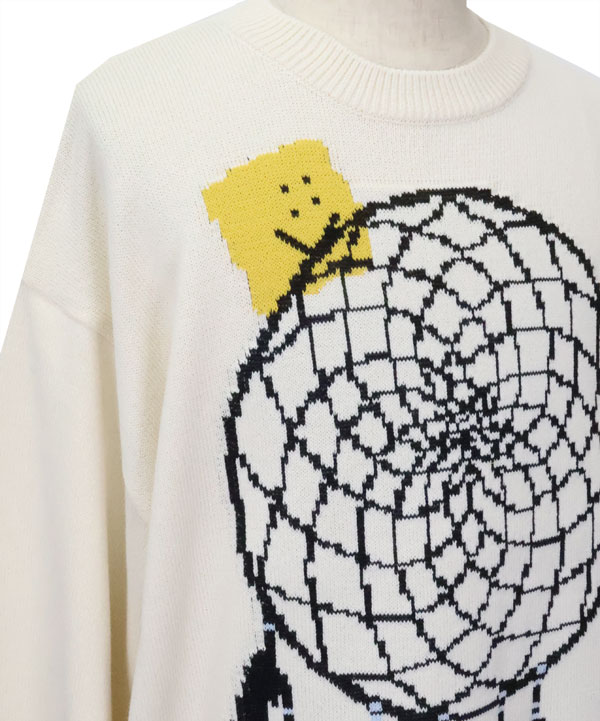 7Gニット PECKISH ドリームキャッチャー クルーセーター7ゲージで仕立てられたBIGシルエットのクルーネックニット。胸元にはPECKISH と悪夢を捕らえて良い夢だけを届けてくれる伝統的なお守りドリームキャッチャーを程こした素敵な一枚。ポリエステル×コットン×アクリル素材。薄手で柔らかな生地感、着心地の良さもご体感ください。1サイズと3サイズの展開アイテムカラー:キナリ