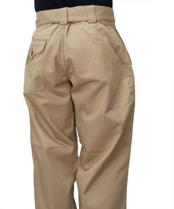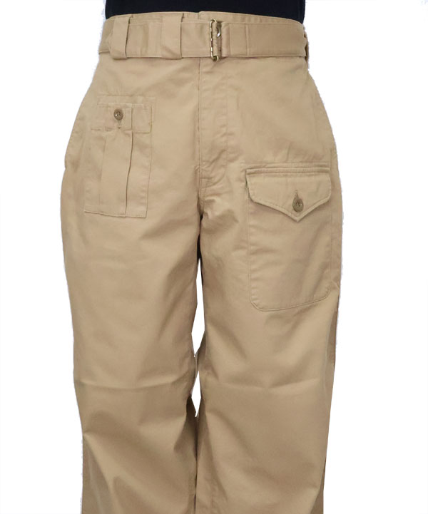 フレンチアーミーのモーターサイクルパンツの特徴的な共地ベルト仕様とブリティッシュアーミーのオーバーパンツのフロントのポケット仕様を掛けあわせたミリタリーパンツ。