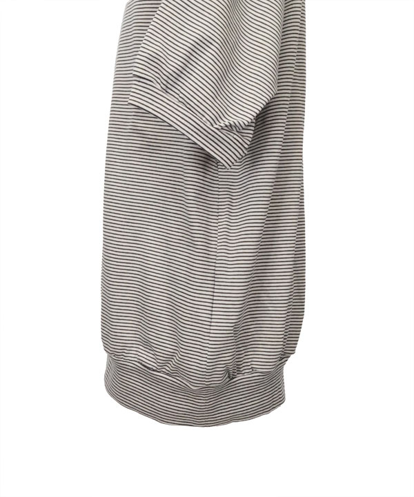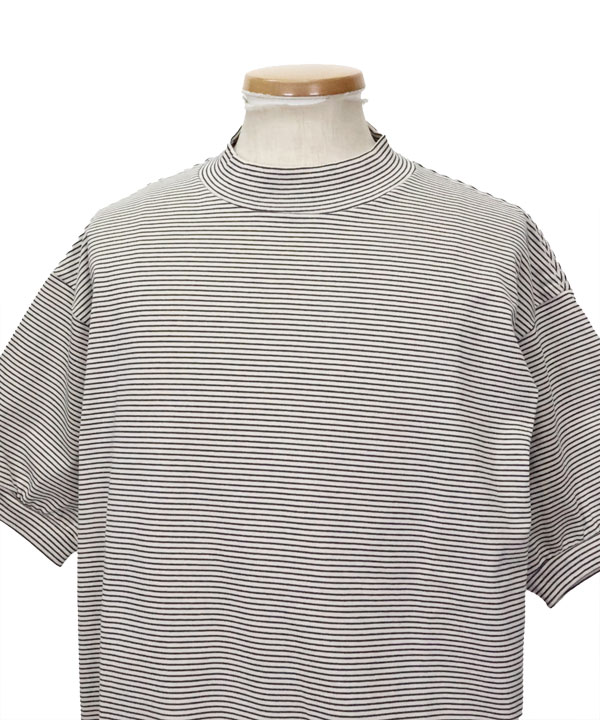 細ピッチのオリジナルボーダー天竺を使用した半袖スウェットデザインのモックネックTEEです。