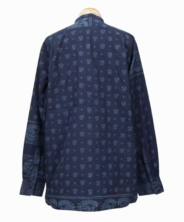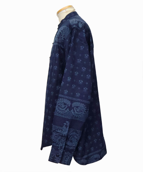 当時のようなインディゴの色目に深みを持たせる為、可抜染料で下染めし、インディゴ染めを重ねオートスクリーンでは出来ない100cmの柄を2枚で手捺染(ハンドスクリーン捺染)大版プリントを施しました。