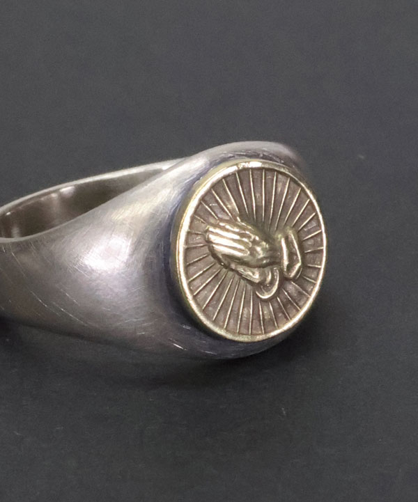 HAND リング"祈りの手" のデザインのブラス製メダイをトップに施した印台リング(シグネットリング)です。ベースのシルバー部分には銀製品を表すライオンホールマークが打刻されています。自分の想いを込めて、お守りとして愛用できる作品です。VR-HAND綾野剛さん着用モデルサイズ:22号素材:シルバー925+ブラス最大幅:14.5mm程度