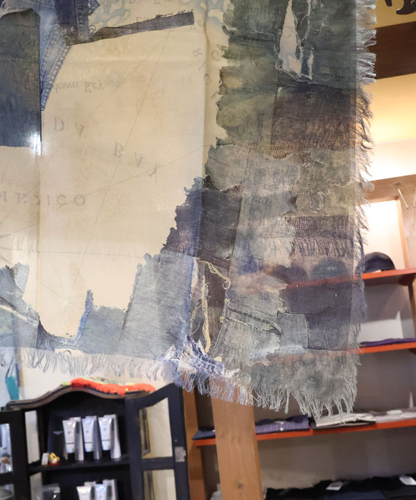 レーヨン フリンジスクエアストール(KAYO HUESO デニムマップ)スクエア型ストールです。そして端はフリンジ始末になっており、ドレープ感のあるレーヨン素材を使用しています。タテ100㎝×ヨコ100センチカラー:ブルー