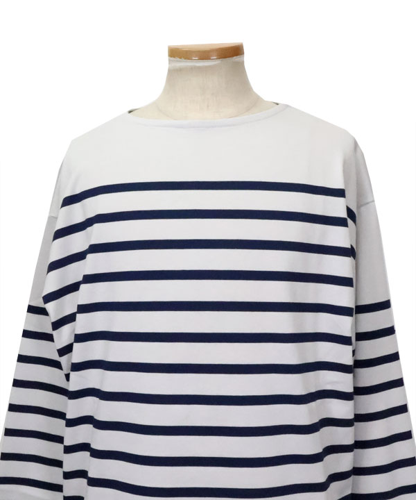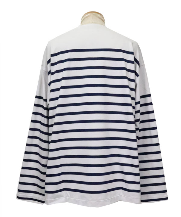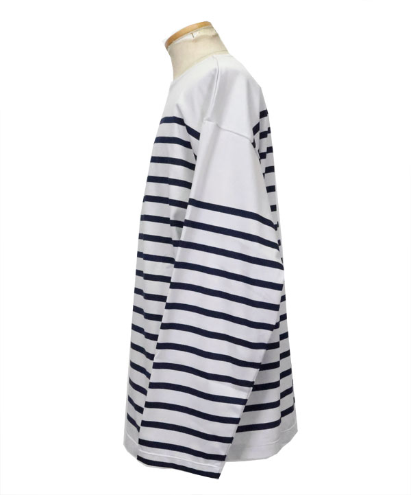 1985年の映画「生意気シャルロット」の中でゲンズブールとジェーンバーキンの実子のシャルロットゲンズブール(14歳)が劇中に着用していたフレンチボーダーTEEをモチーフに作成。80's独特なオーバーサイジング、ハイウエストデニムにタックインが微笑ましい。今の気分のゆったりふんわりとしたシルエットで絶妙なサイズバランスに仕上げられています。肩の無地部分の分量に個性があるパネル柄を忠実に再現しました。