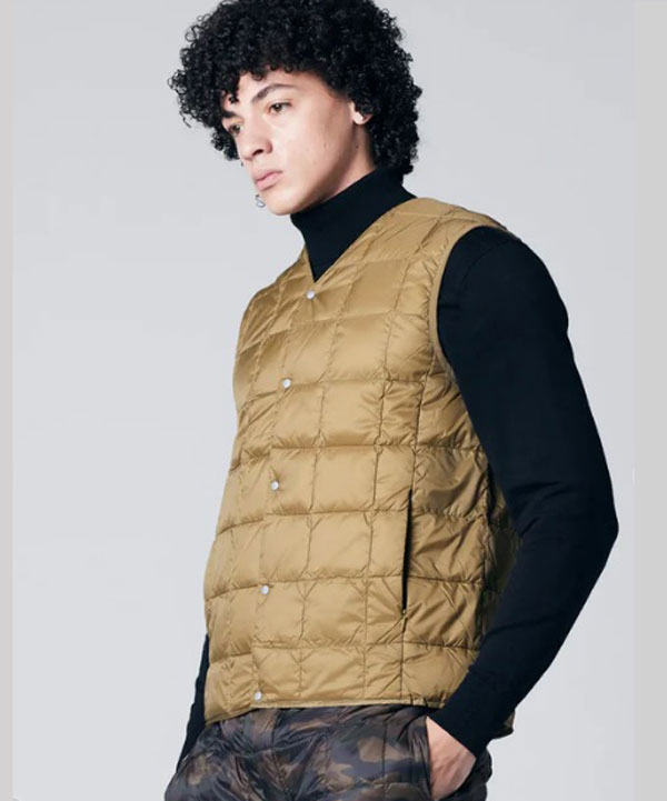 TAIONの定番、ベーシックインナーダウンは、ジャケットやコートの下に着るのはもちろん、Tシャツ・シャツ・パーカーなどの上にも気軽に羽織れる、軽くて暖かく着回しやすいシンプルなデザインが特徴です。