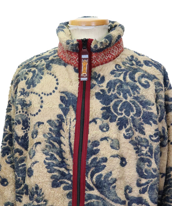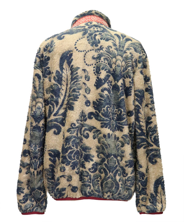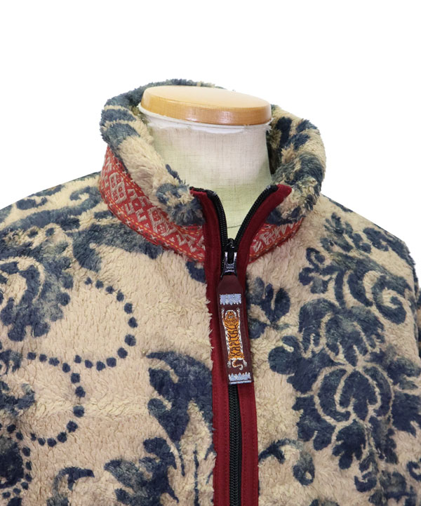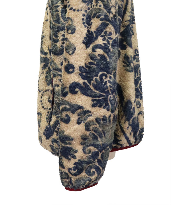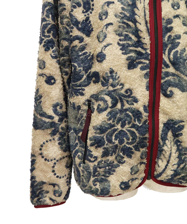 ダマスク模様のフリースブルゾン。ダマスク織の古布からサンプリングを行い、古布特有の色目、風合いをフリースで再現しています。