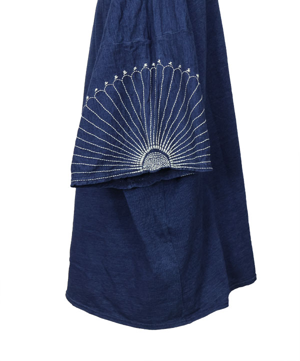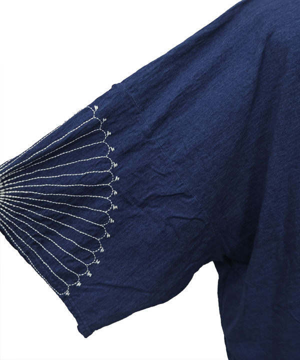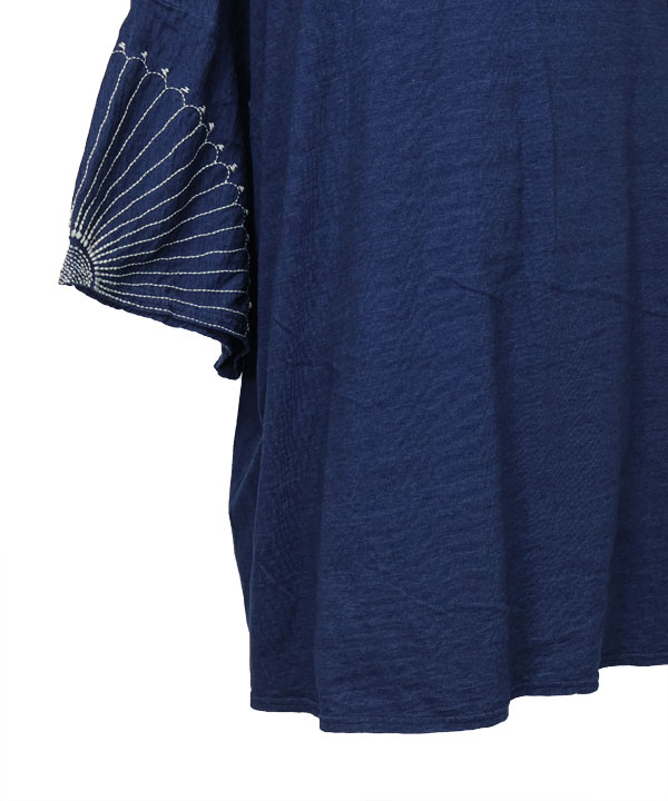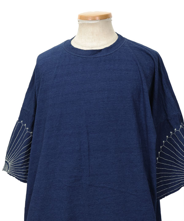 インディゴ天竺 HUGE-T(風呂敷刺繍)両袖に伝統民芸である刺し子を施した風情のあるHUGE-T。インディゴの天竺生地で仕立てており、ゆったりとしたビッグシルエットとなっています。経年変化によるインディゴの風合いも楽しめる一枚!ぜひお試しください。カラー:インディゴ