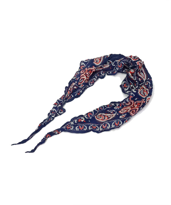 ワッシャーシルク ネッカチーフ(Samboペイズリー)ペイズリー柄のネッカチーフ。シルクをシワ加工しています。菱形になっており、細く丸めやすいため、ボリューム感を抑えてすっきりと首元を彩ることができます。首元のワンポイントにお使いください。ワンサイズ展開長さ:110㎝