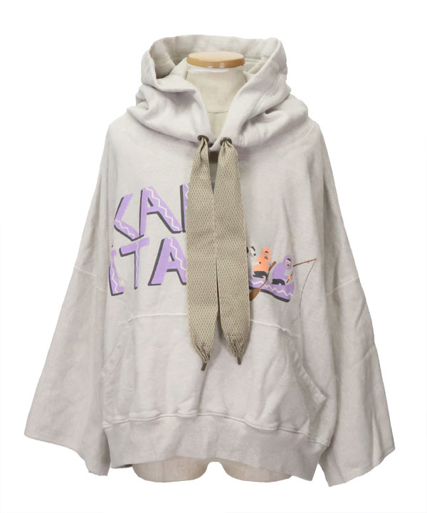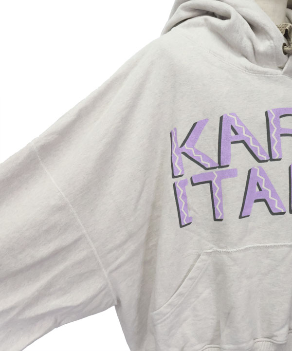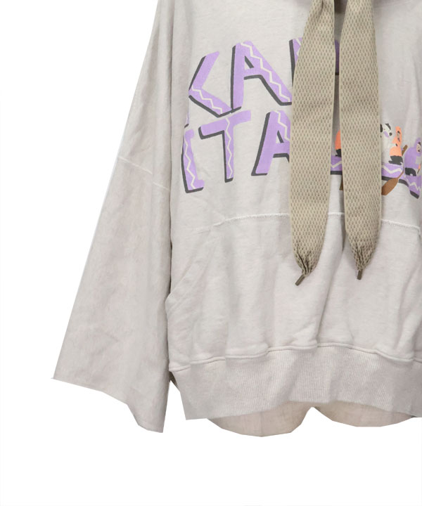 KAPITALジーンズの革ラベルに使用されている「KAP][TAL」のロゴをフロントにプリントした、ショート丈でビッグシルエットのフードスウェットです。