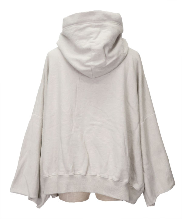 首回りが大きくボリュームのあるフードになっており、幅広のフード紐を使用しています。袖口はカットオフ始末で軽やかなデザイン。