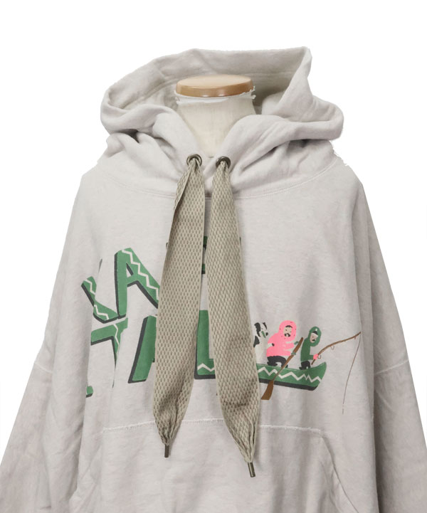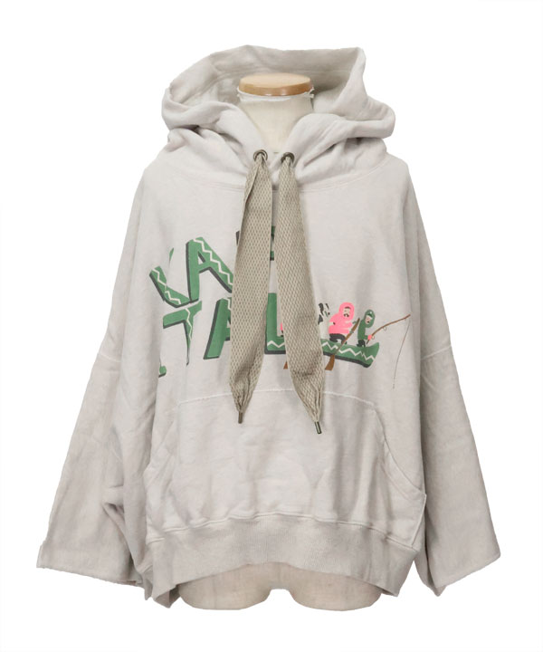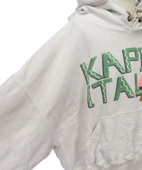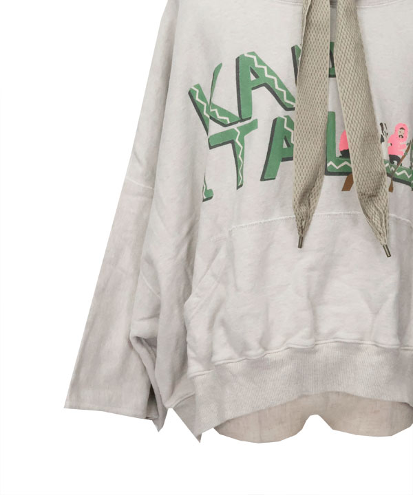 KAPITALジーンズの革ラベルに使用されている「KAP][TAL」のロゴをフロントにプリントした、ショート丈でビッグシルエットのフードスウェットです。