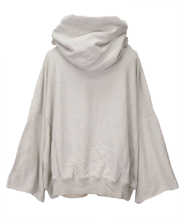 首回りが大きくボリュームのあるフードになっており、幅広のフード紐を使用しています。袖口はカットオフ始末で軽やかなデザイン。