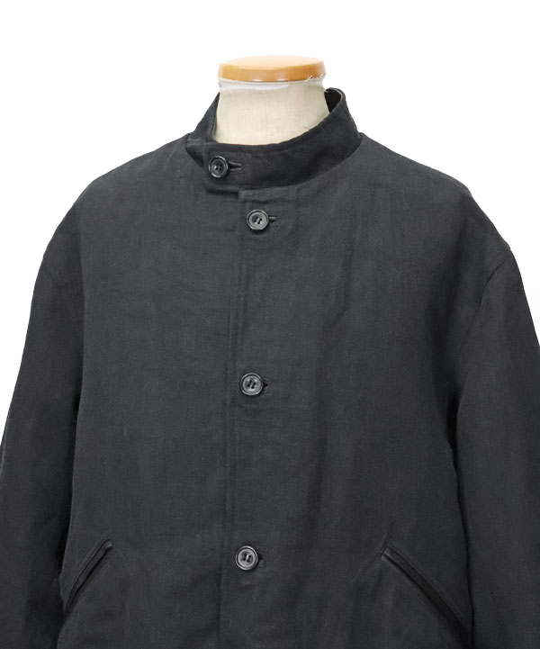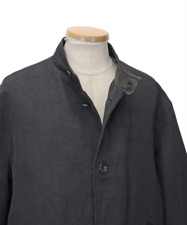 ウールには梳毛と紡毛があり、一般的にビジネススーツは梳毛、ハリスなどのツイードは紡毛となる。紡毛は縮絨などで表情を作りやすいが梳毛はそもそもが細い番手が多いのでなかなヴィンテージニュアンスを製品に入れるのが難しい。そこで伝統的な19世紀のハンティングJKに見られるカパードクロス素材に見立て、縦糸をスーパ-140'sの梳毛、緯糸にヘンプ麻を打って製品で洗うことで、ポールハーデン調な枯れた立体感のある生地作りに成功しました。