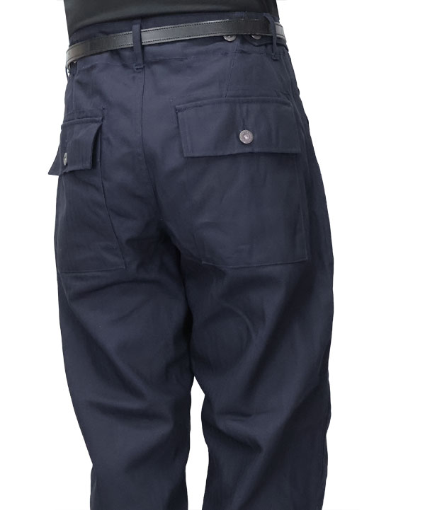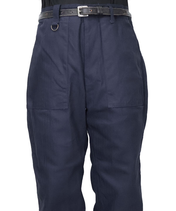 ミリタリーパンツを代表するベイカーパンツをモチーフにベルトループにDカンをつけ、またウエストアジャストベルトはクラシックな流線型とするなどのアレンジを加えた一本。