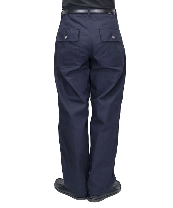 素材はオーガニックコットンの強撚糸で織り上げたUS ARMYのそれをリプロした超高密度のヘリンボーンツイル。ボタンは月桂樹ネオバボタンを使用。
