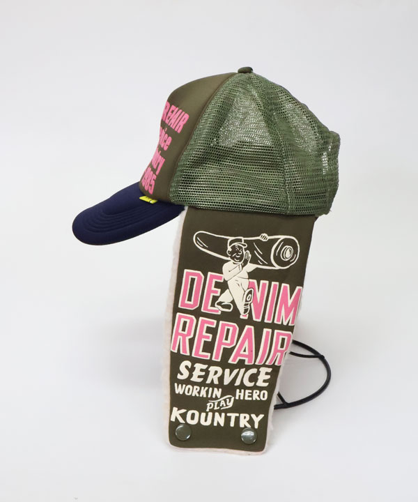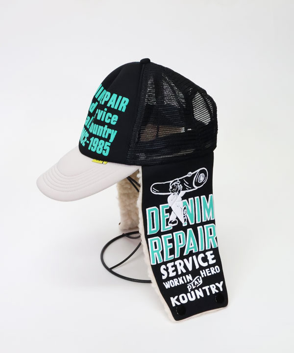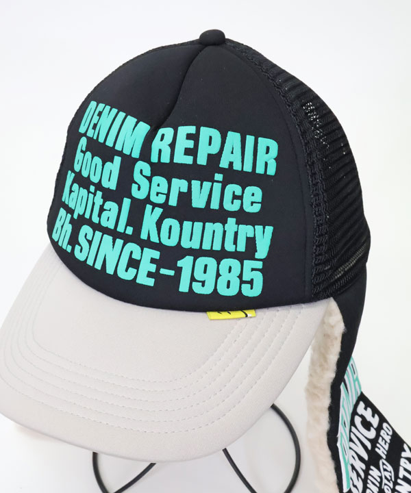 DENIM REPAIR SERVICEpt ランバートラックCAPフロントに発泡プリントを施したトラックCAP。内側の縁がパイル地になっています。そしてボア耳当て付きデザイン!お楽しみください。ブラック×グレーカーキ×ネイビーワンサイズ展開