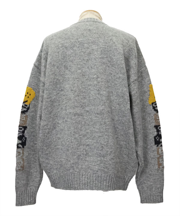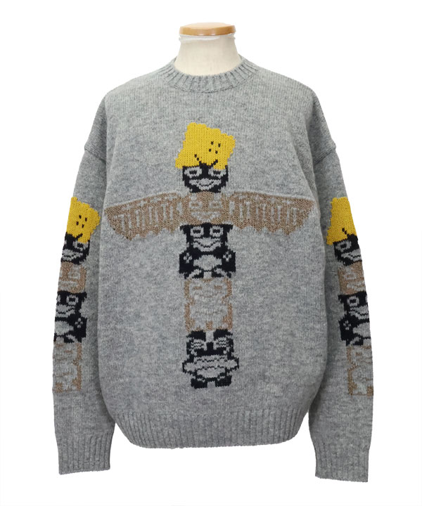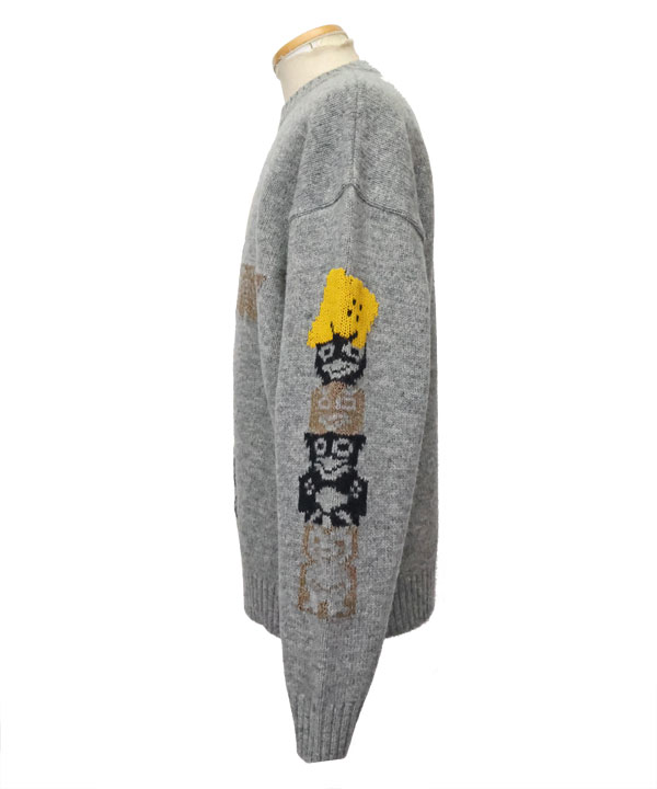 5Gウール PECKISHトーテムポール クルーセーターゆったりしたサイズ感のセーターです。フロントと袖には、クッキーになったRAINBOWYとトーテムポールをデザイン。ざっくり着ていただけるおすすめの一枚です。カラー:グレー1・3サイズ展開アイテム