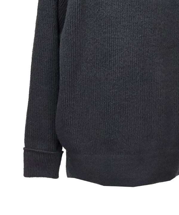 ハンドフレーム機(手横編み機)を駆使して手編み感覚を表現したリブ編みと、通称”ヘラシ”と呼ばれるニットワークで前後にアールした編地のディテールを表現する特殊なデザインとなっています。