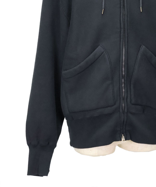 カタチは、MA-1の襟リブの様な襟元の外側にフードを縫製してスポーティーになりすぎない様に工夫されています。また袖は大きめのアームホールのドルマンスリーブデザイン。