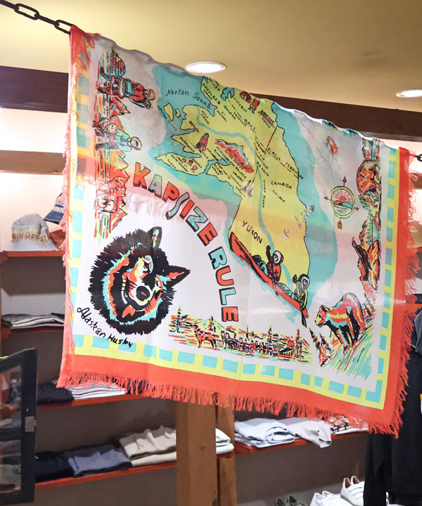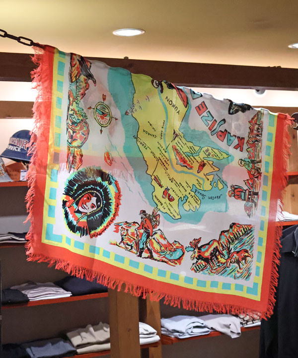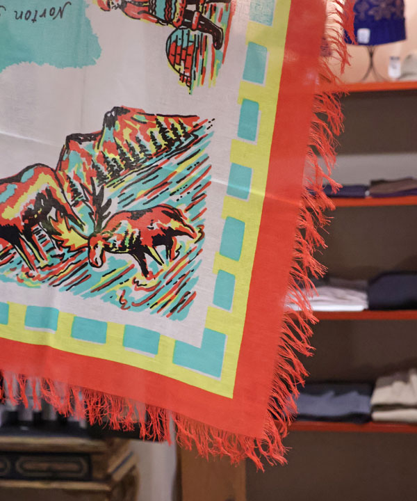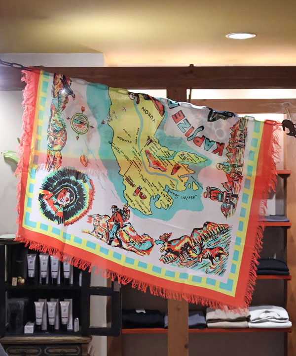 フリンジストール(YUKON Life Map)40×40カナダのユーコンで暮らす人々のMAPが施されたスクエア型ストールです。タテ97㎝×ヨコ96センチカラー:キナリ