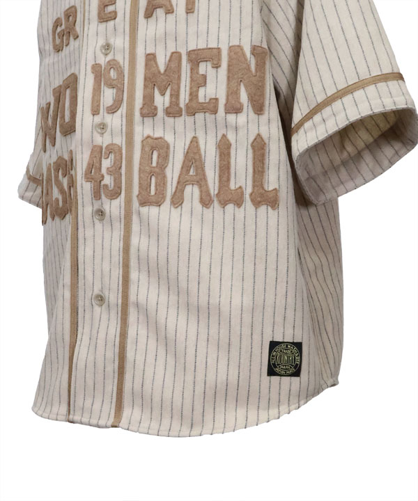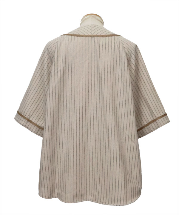 ウールストライプ(細)GREAT WOMEN ベースボールシャツウール生地を使用する細いストライプ柄のベースボールシャツ。シンプルでややワイドなシルエット。そしてフェルトのGREAT WOMENロゴを施しています。レイヤードアイテムとしてお使いいただけます。カラー:キナリ2・3・4サイズ展開