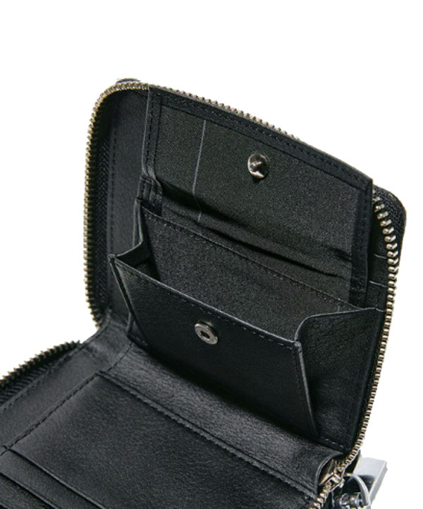 コの字型のファスナー内部には、マチ付き&スナップボタン式のコイン室、仕切り付きの札室、カードポケット6つを備えています。
