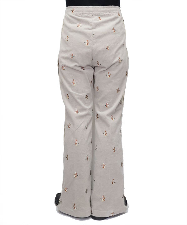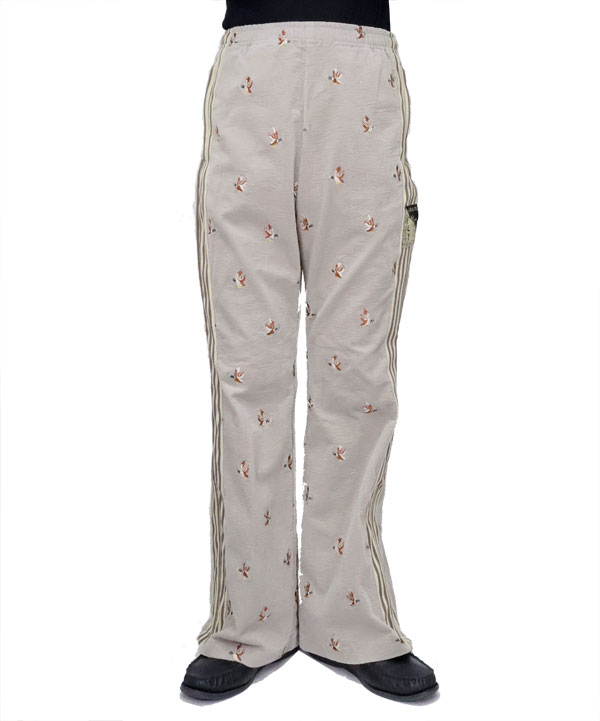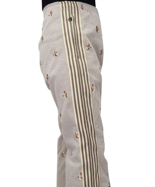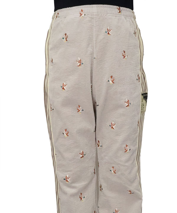 11Wストレッチコーデュロイ 鴨刺繍 トラックパンツ(バナーストライプ)伸縮性あるストレッチコーデュロイ生地に鴨の刺繍が全体に施されたトラックパンツ。ウエストはイージー仕様でサイドのラインもポイントとなる快適な一本です。両裾にファスナーを取り付けています。ぜひお試しください。カラー:グレーベージュ*セットアップにもなります。