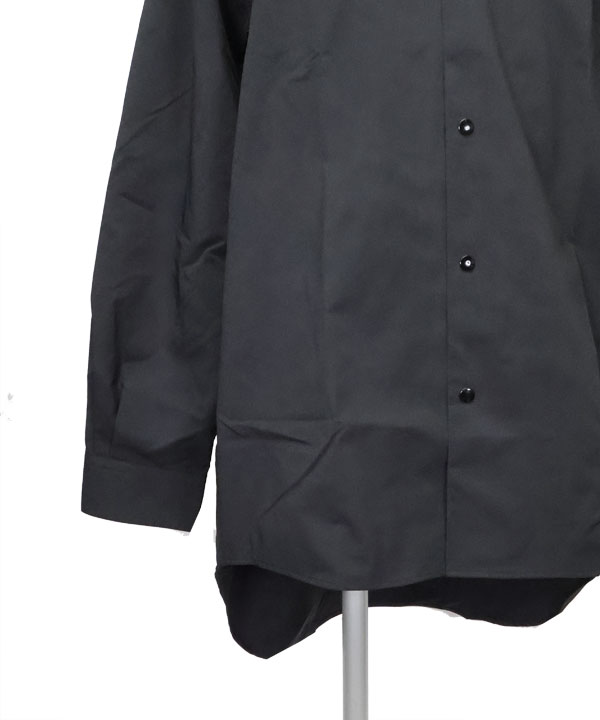 カタチは、前丈をやや短く、後丈を長めに設定した前後差のある着丈が特徴。後身頃には広がりを持たせることで、動きのある立体的なシルエットを生み出しています。
