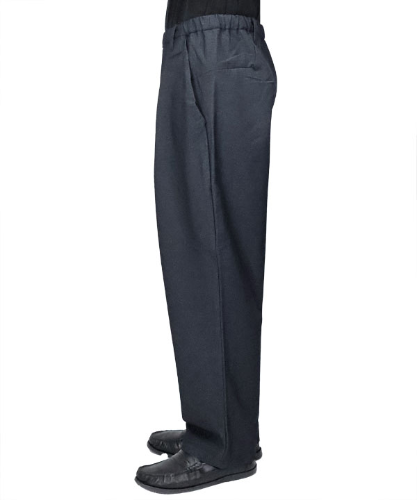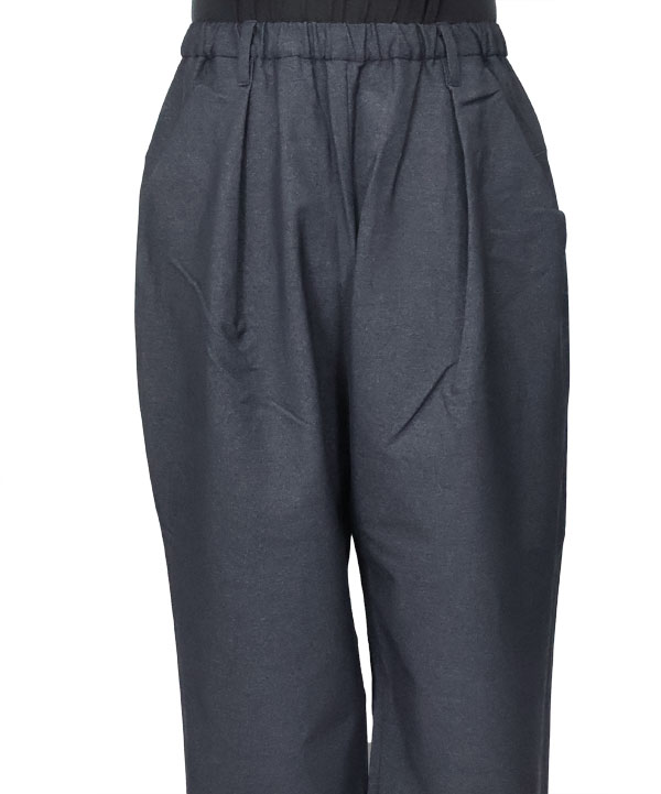 ウエストはゴム&紐(内側に付属)のイージー仕様となっていて、ゆったりとリラックス感ある太さのテーパードシルエット。