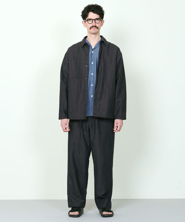 比較的薄手な素材ながらワッシャー加工を入れることで、綿麻の縮率の差からふくらみのある表情が特徴です。